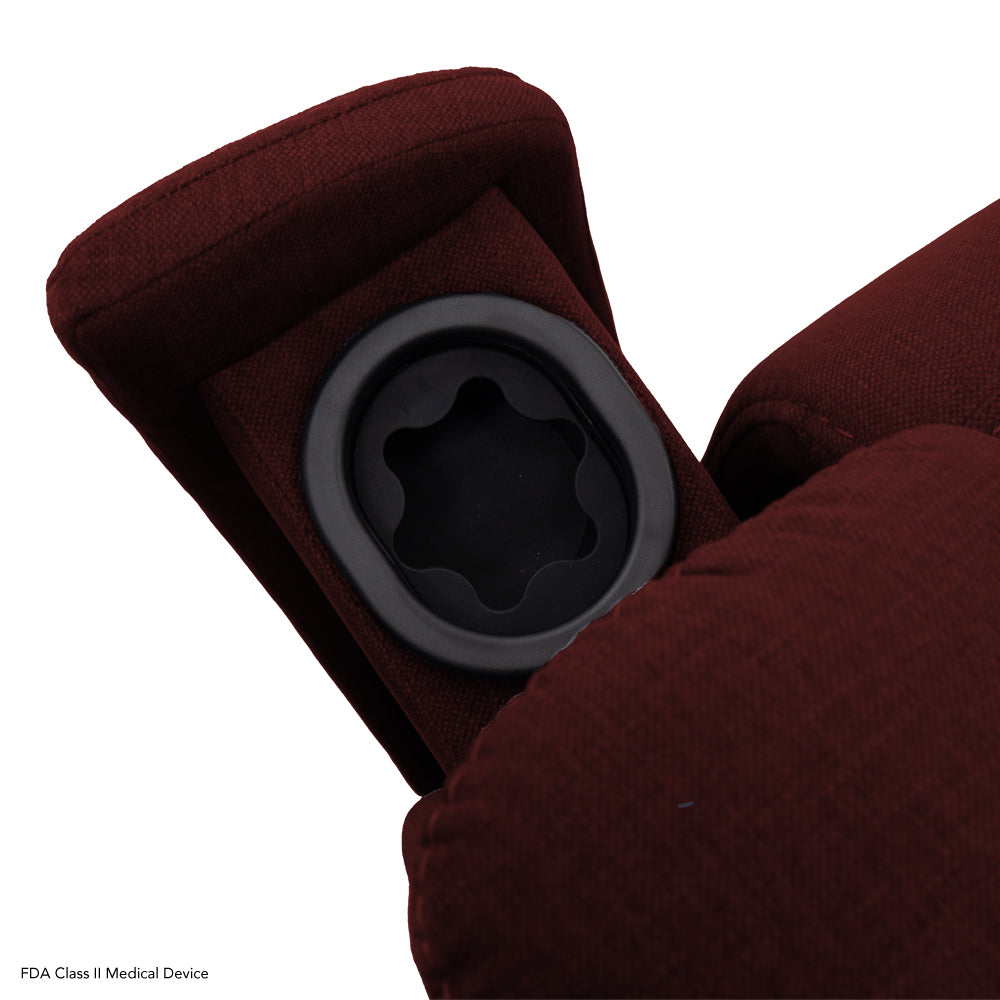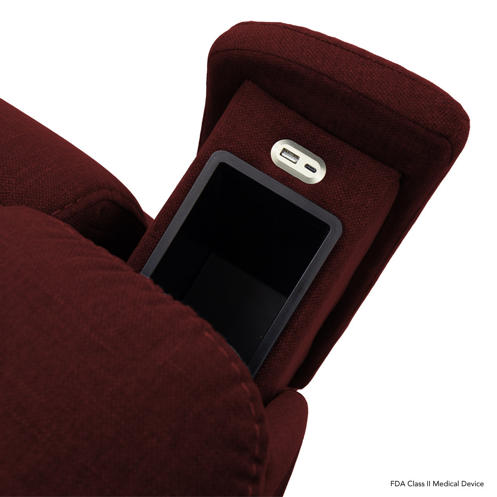 - Small, medium, and large models feature a cup holder, armrest storage with USB-A/USB-C charging ports, and magnetic hand control dock on both sides